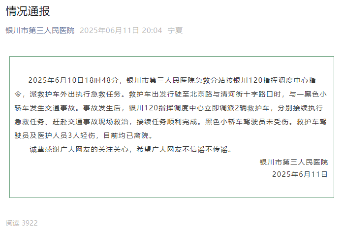 2025年6月10日18时48分,银川市第三人民医院急救分站接银川120指挥调度中心指令,派救护车外出执行急救任务。救护车出发行驶至北京路与清河街十字路口时,与一黑色小轿车发生交通事故。事故发生后,银川120指挥调度中心立即调派2辆救护车,分别接续执行急救任务、赶赴交通事故现场救治,接续任务顺利完成。黑色小轿车驾驶员未受伤。救护车驾驶员及医护人员3人轻伤,目前均已离院。